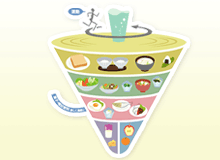 これをさらに具体化し、「何を」「どれだけ」食べたらよいのかを示したのが、「食事バランスガイド」です。「食事バランスガイド」は食育の推進や食環境そのものを整備し、さらに充実させるため、フードビジネス現場での活用や、マスメディアも含めた情報ツールとして利用することで、国民の食生活改善を目指しています。
